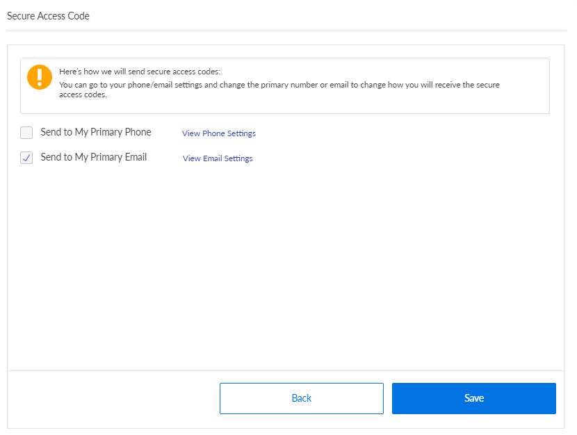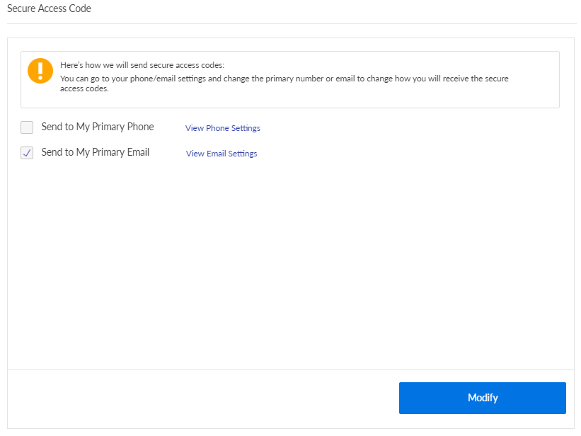 - Click Modify to change if you want the app to send the secure access code to your primary email ID or primary phone number or both.