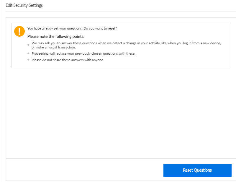 Under the Security Settings section, click Security Questions. If you have not set up the security questions earlier, you can set up the questions now. Otherwise, click Reset Questions. The app displays the Edit Security Settings screen.