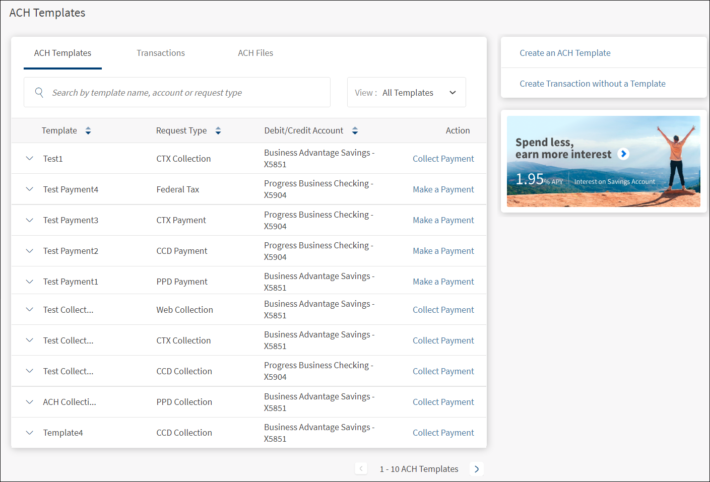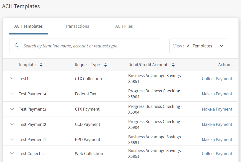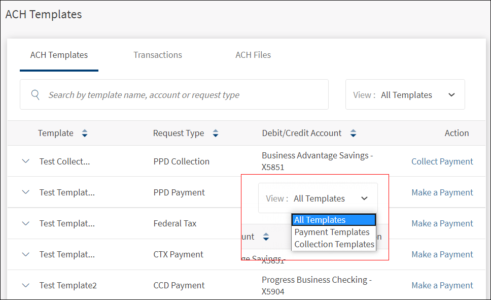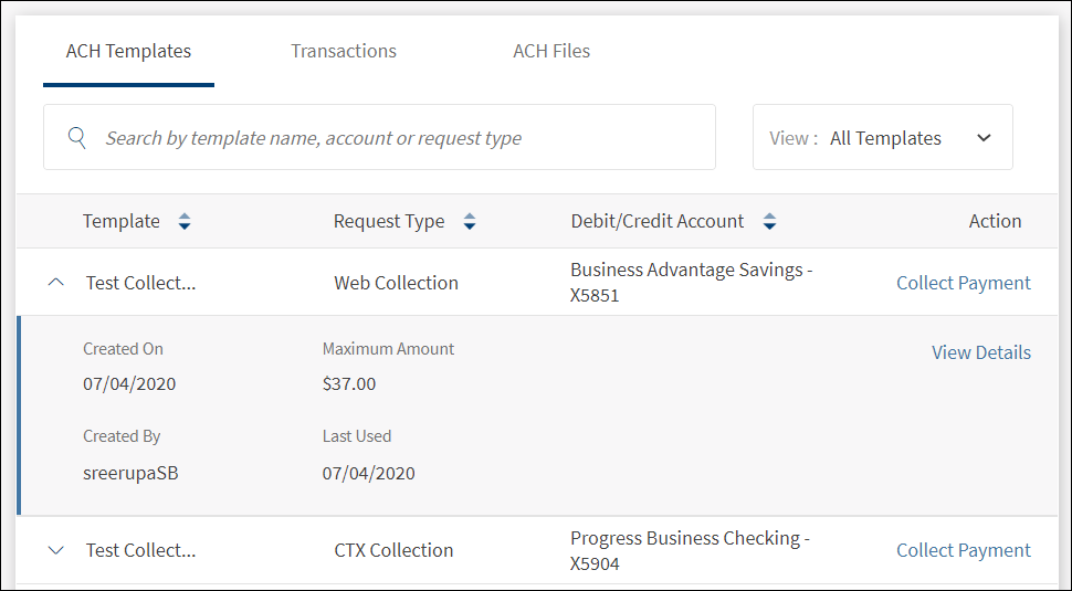 Use the feature to create or initiate an ACH transaction using the payment or collection templates that were already created and available on the ACH Templates tab.