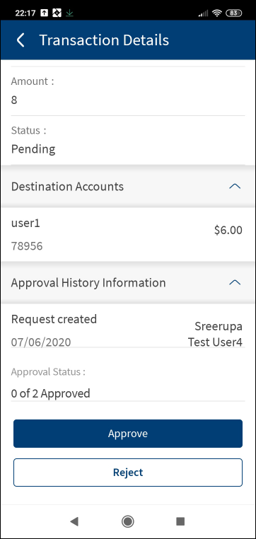 - Applicable only to those users who have the required permissions to approve or reject transactions and the user is one of the approvers for the selected accounts as defined in the approval matrix.