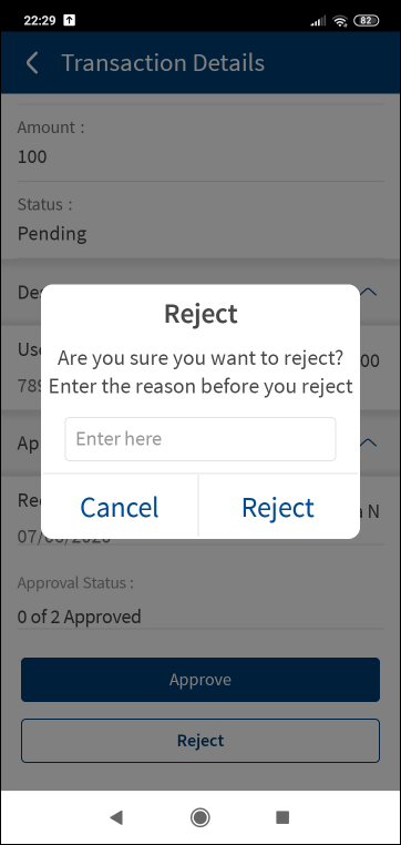 - Reject: Applicable only if the user is one of the approvers for the transaction. Click to reject the transaction.