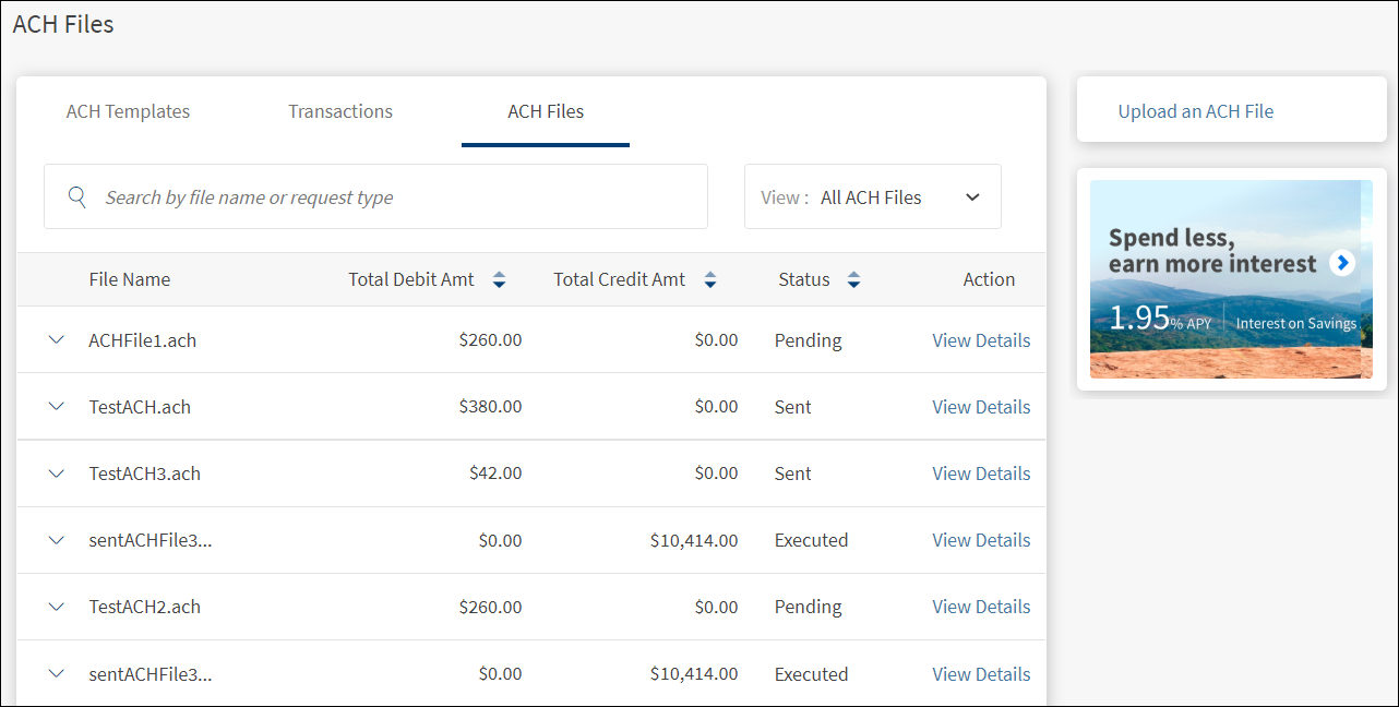 - After an ACH file is uploaded, the file is added to the ACH files list.