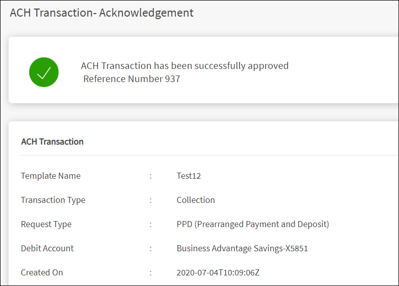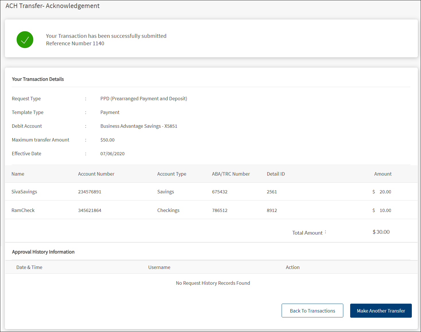 - The application displays an acknowledgment screen with a message that the transaction request is sent for approval along with a reference number. The transaction is added to the list of transactions on the Transactions tab.