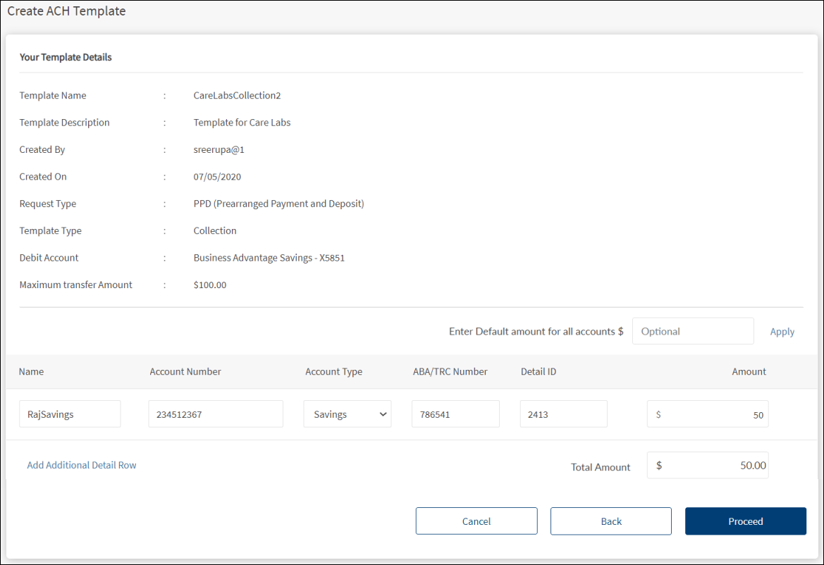 On the ACH templates tab, click any template row, and then click View Details. The application displays the additional details on the selected template.