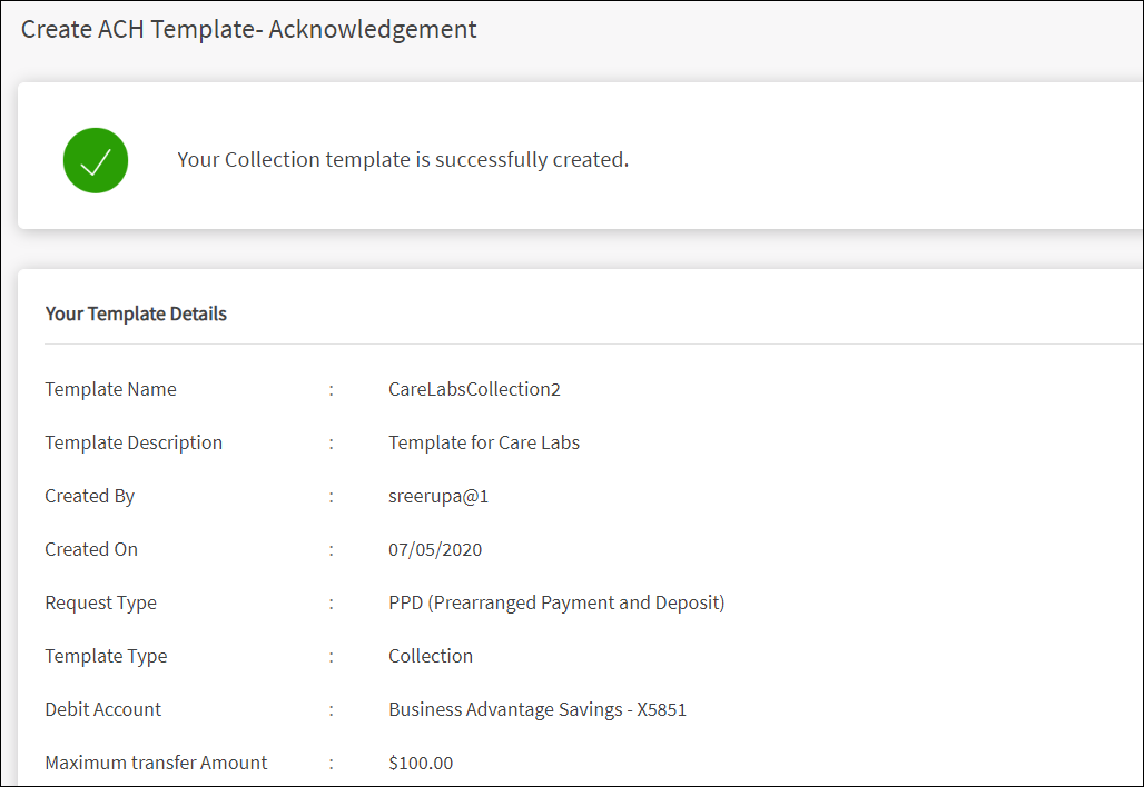 - The application displays an acknowledgment screen that the template is created successfully. The template is added to the templates list on the ACH templates tab with the status as "New". The template is ready for performing transactions.