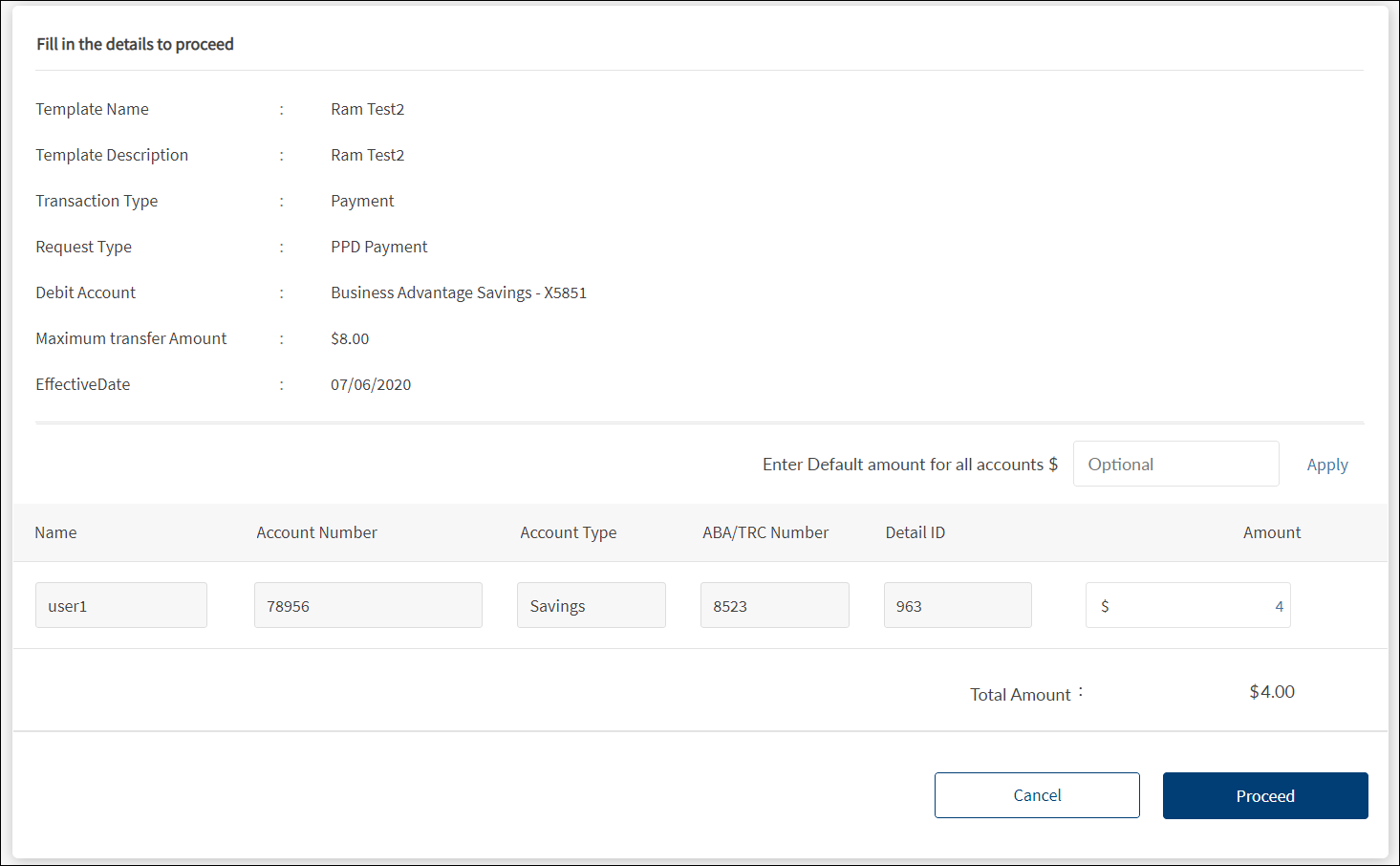 - The application displays the list of recipients who are saved in the template with respective amount. Use the option to remove the recipients or modify the existing ones before submitting the transaction. Change the amount of the transaction if required, but the total amount should not exceed the maximum transfer amount.