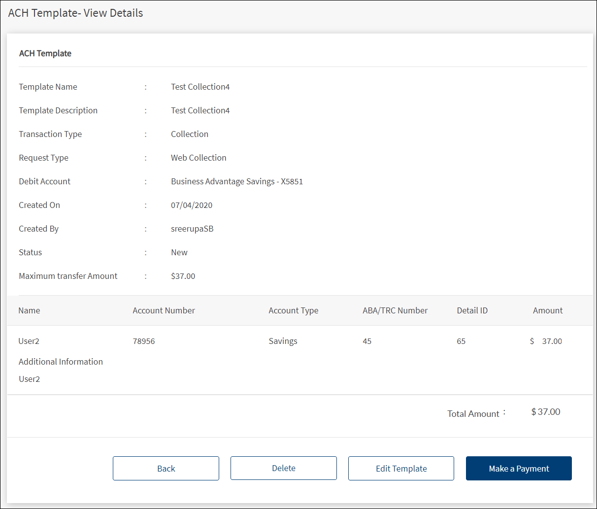 - On the ACH Templates tab, from the list of templates, click the Collect Payment or Make a Payment link. The application displays the template details screen based on the selected template.