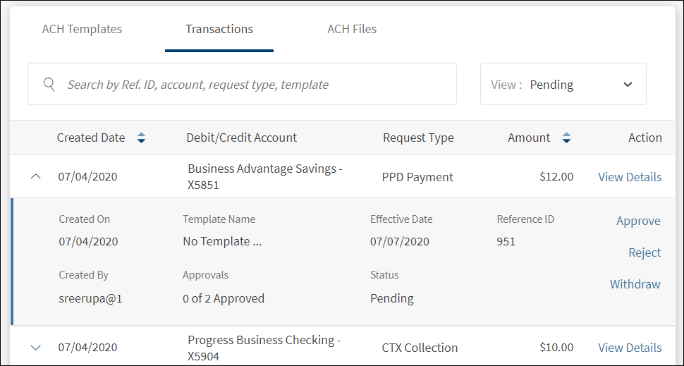 - Pending: All ACH collection and payment transactions that are pending approval of the logged in user.
