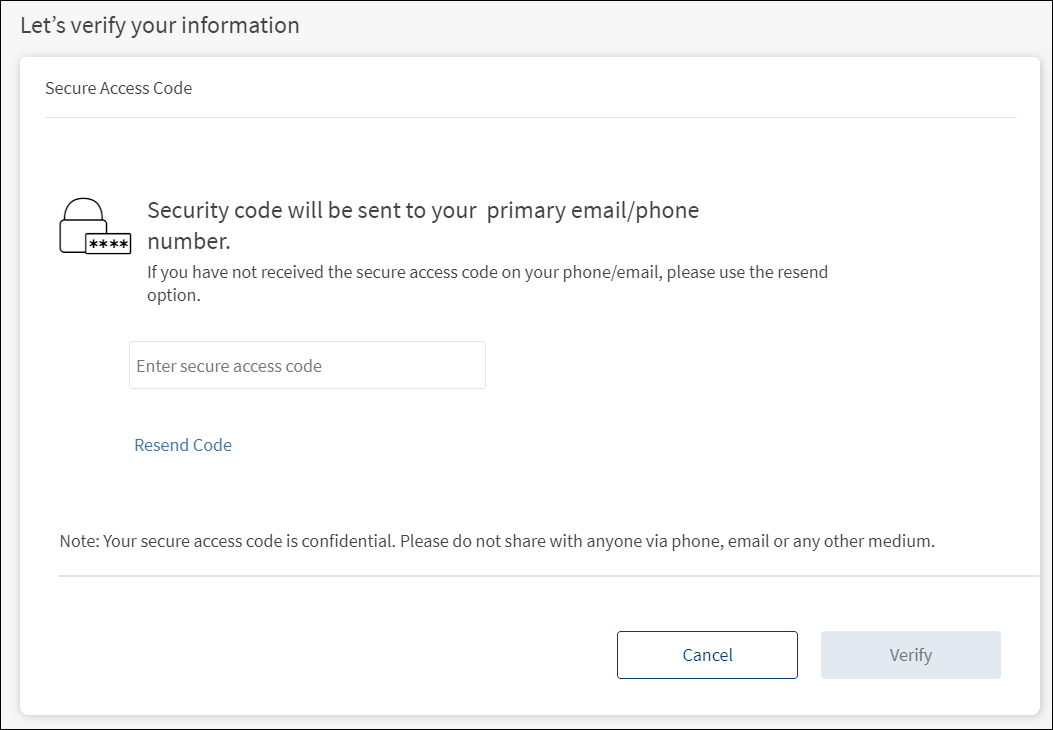 - Depending on the bank configuration, you must either provide the secure access code that is sent to your registered mobile number and email ID or must answer the security questions.
