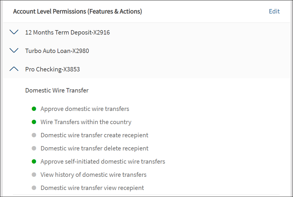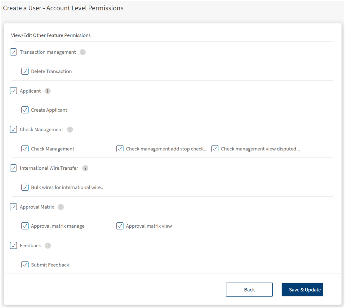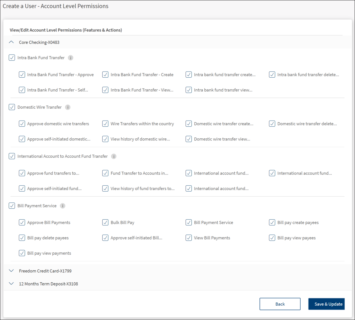 Displays the permissions given to the user to access the features and associated actions at the account level. Make the changes by selecting or clearing the feature check boxes of respective accounts. Click Save & Update. The changes are updated. The user permissions and transaction limits changes based on the changes.