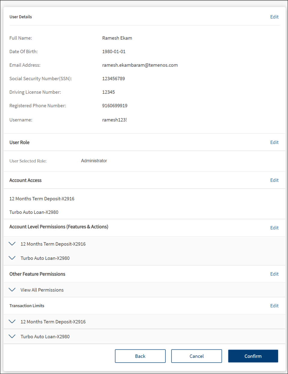 After reviewing the user details, permissions to features, and defining the transaction limits, click Confirm.