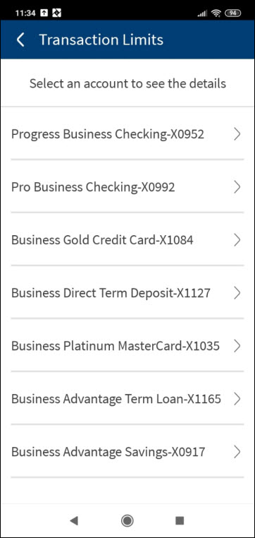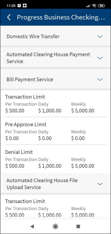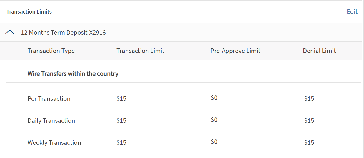 - Click the arrow to view the defined transaction limits for a service of the selected account.