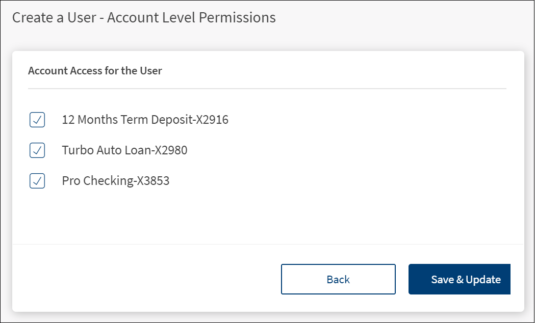 Displays the list of accounts to which the user has been provided access. Make the changes by selecting or clearing the account check boxes. Click Save & Update. The changes are updated. The user will be able to view or operate only the selected accounts when the user signs in to the application.