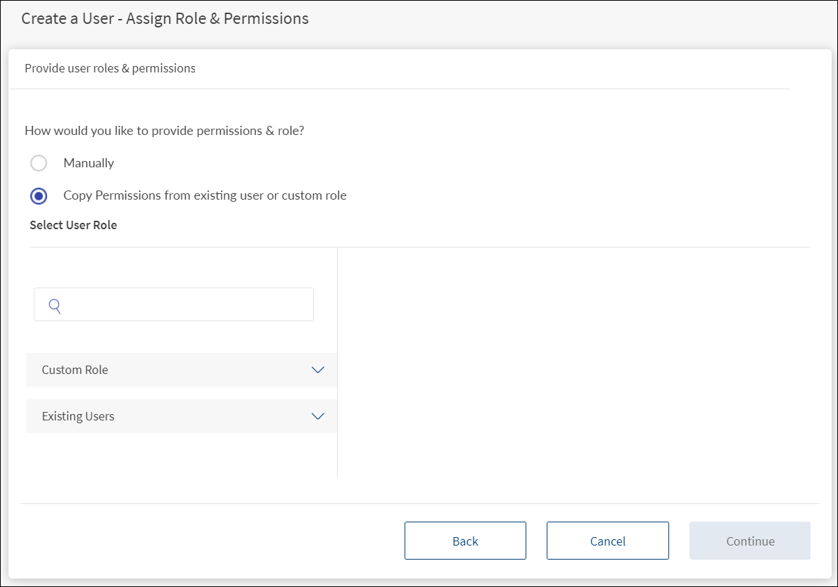 At the time of user creation, an authorized user can create a user manually or copy permissions either from an existing custom role or an existing user. The following permissions are copied from the custom role into the user’s profile on selecting the copy permissions option. if necessary, the copied permissions can be modified before confirming the creation of the new user.