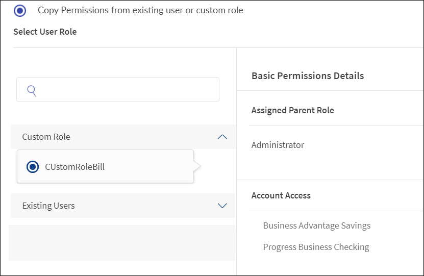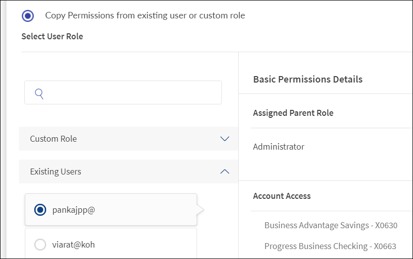 Use the feature to create a business user and assign a role with permissions to access accounts and features. Business owners and other authorized manager of business users can control access to various features at user level at the time of user creation or editing the user permissions after the user has been created. A business user can create a user only if "Create Users" permission under User Management feature is enabled.