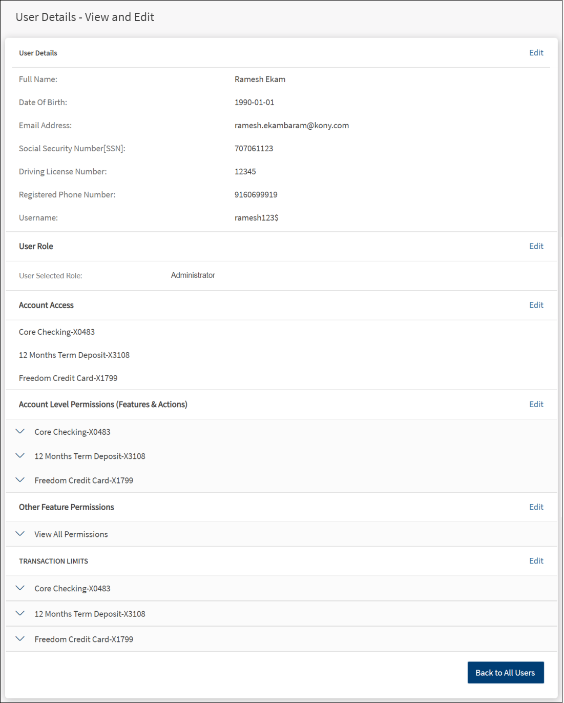 - View the user details such as full name, email ID, date of birth, SSN, driver's license number, phone number, user name, user role, and last signed in date.