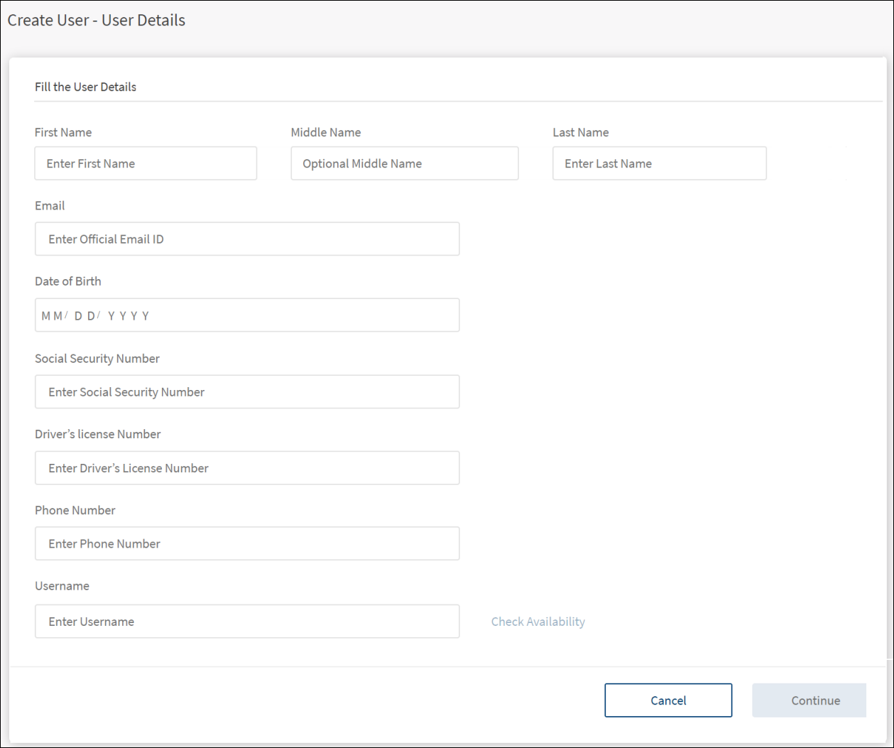 Menu Path: Side Menu > User Management > Create a User. Alternatively, on the User Management screen, click Create a User. The application displays the Create User - User Details screen.