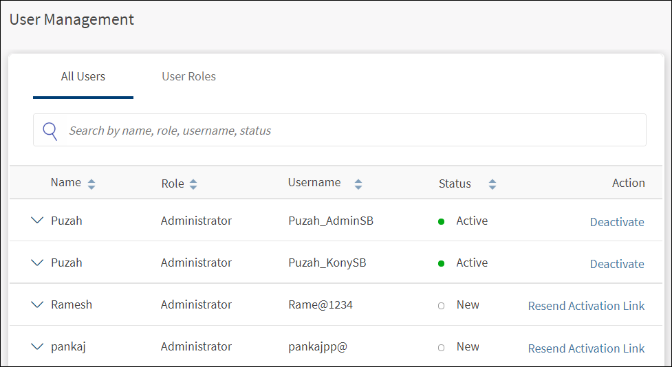 Use the search option to search for a business user using the search criteria. Enter the search keyword in full or in part. Search by name, user name, role, or status.