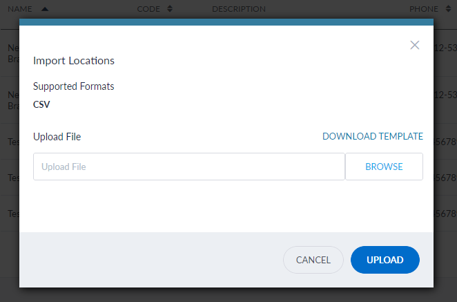 - Click Import CSV File to import a branch or ATM list. To get the template for providing the information for the required fields, click Download Template link on Import Locations pop-up.