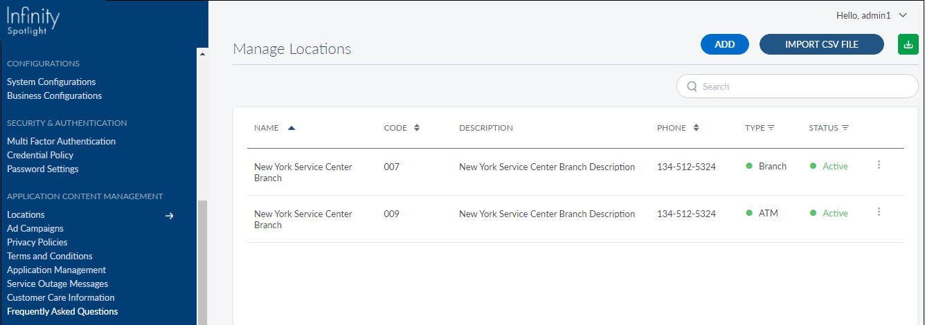 User can upload a CSV file to import a list of branches and ATMs. Click the Import CSV File button shown on the top-right of the Manage Locations page. The file format must match with the fields available in the ADD feature.