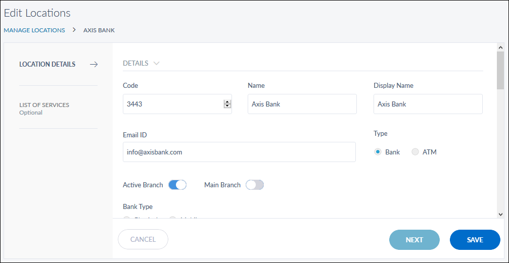 The edit screen is similar to the add a branch or ATMscreen, and allows the user to modify the details of the branch or ATM. User can make the changes as per the guidelines mentioned in Locations Details and List of Services. Save the details.