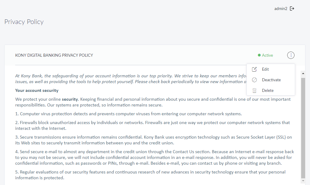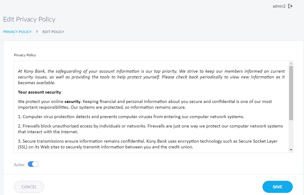 Use the feature to manage the privacy policy that is displayed to the end customer in the Retail Banking applications. Spotlight has only one Privacy Policy for the end user and hence, there is concept of adding new policies, only editing the currently added privacy policy is possible.