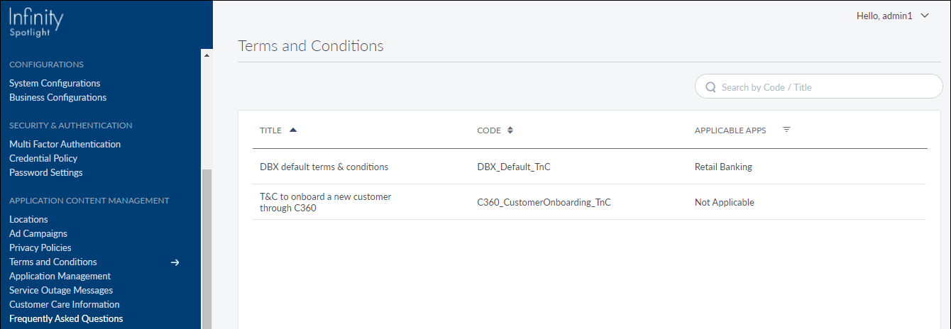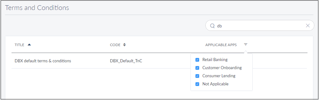 The Terms and Conditions landing page lists the terms and conditions (T&C) for different applications. Each T&C is shown in rows with the details: Title, Code, and Applicable Apps. You can sort the list based on Title or Code using the sort