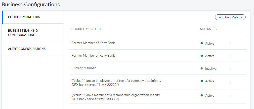 available on each row and update the status based on the current status of the criteria. The following statuses are available: Activate, Deactivate. For example, if the current status Active, you can deactivate the criteria. Only active criteria will be displayed during the onboarding process in the customer-facing application.