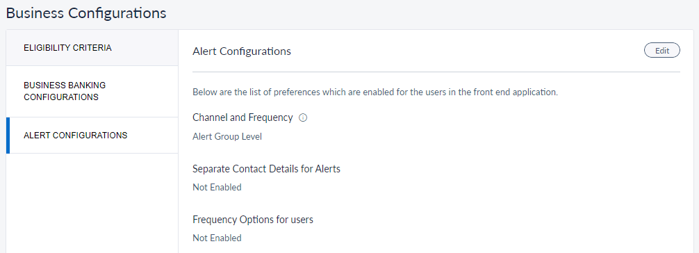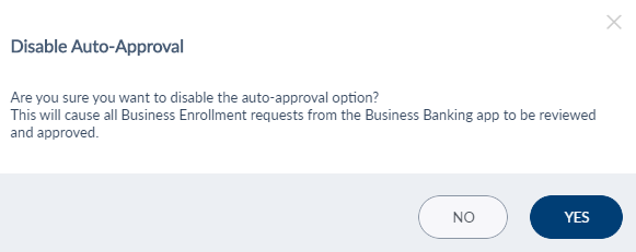 - Business Enrollment Approvals - You can enable or disable this configuration from here. If you enable this configuration, all the business enrollment requests received from the Online Banking application are approved automatically.