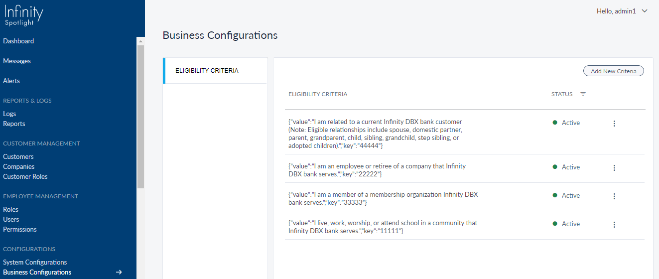 - These configuration values are fetched when the “eligibility criteria” page is displayed in customer facing app.