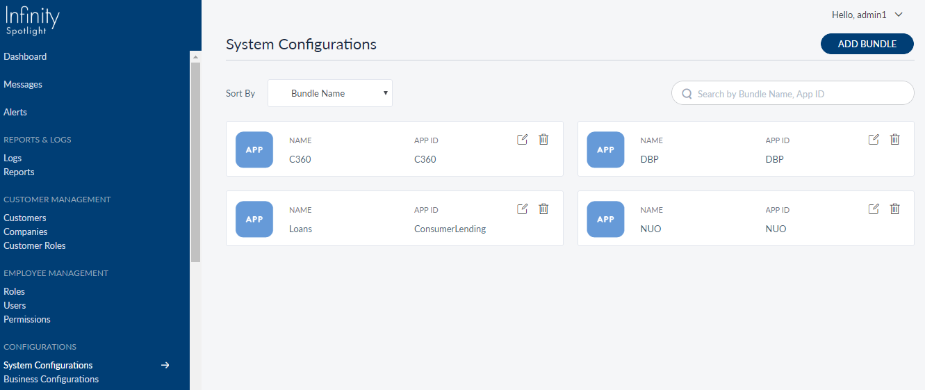 The Spotlight application can be used for defining configurations that can be used by the digital banking applications. Use the feature to manage the configuration around enabling the onboarding process and also to define configuration sets (bundles). The following features are explained in this section: