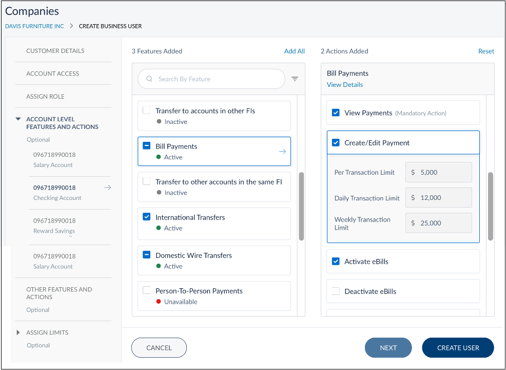 From the list of features displayed for an account, the user not only can select the required features but also pick and choose actions associated with them. Click the View Details option displayed below a feature name. It shows a list of actions, check the boxes shown against each action. For features involving transactions or bill payments, you can also define the transaction limits for the selected actions. Selecting actions associated with a feature is possible only after adding the feature.