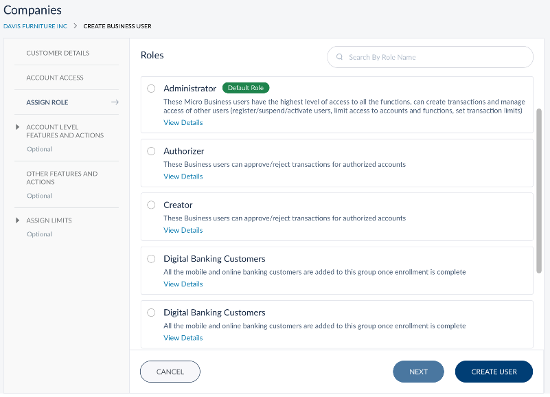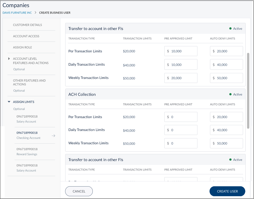 As the remaining sections are optional, you can click Create User to create the authorized signatory or click Next to configure account level features and actions. If you click Create User, the default limits prescribed by the Financial Institution is set in the to the features in the remaining section.