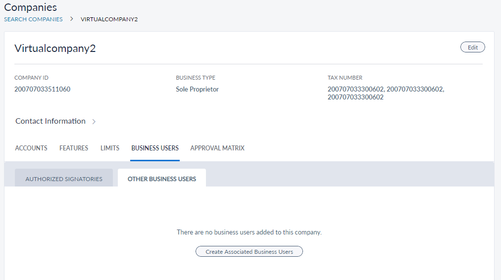 The Business Users tab shows a business user or a list of business users associated with a company. Other business users are those users who are not customers of the banks but have access to business accounts on account of customers delegating access to business accounts. The User details, Role, Username, Status, and Email are shown for every business user associated with the company.