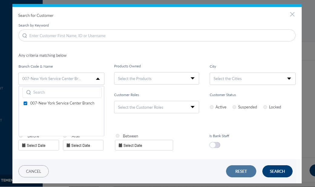 Use the feature to search for the customers that match specific criteria such as branch code and name, products owned, city, permissions, roles, and customer status. You can also match the search criteria with dates that the customer has joined by specifying the required date criteria.