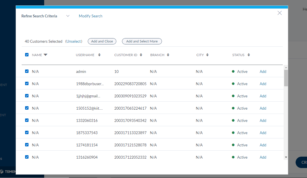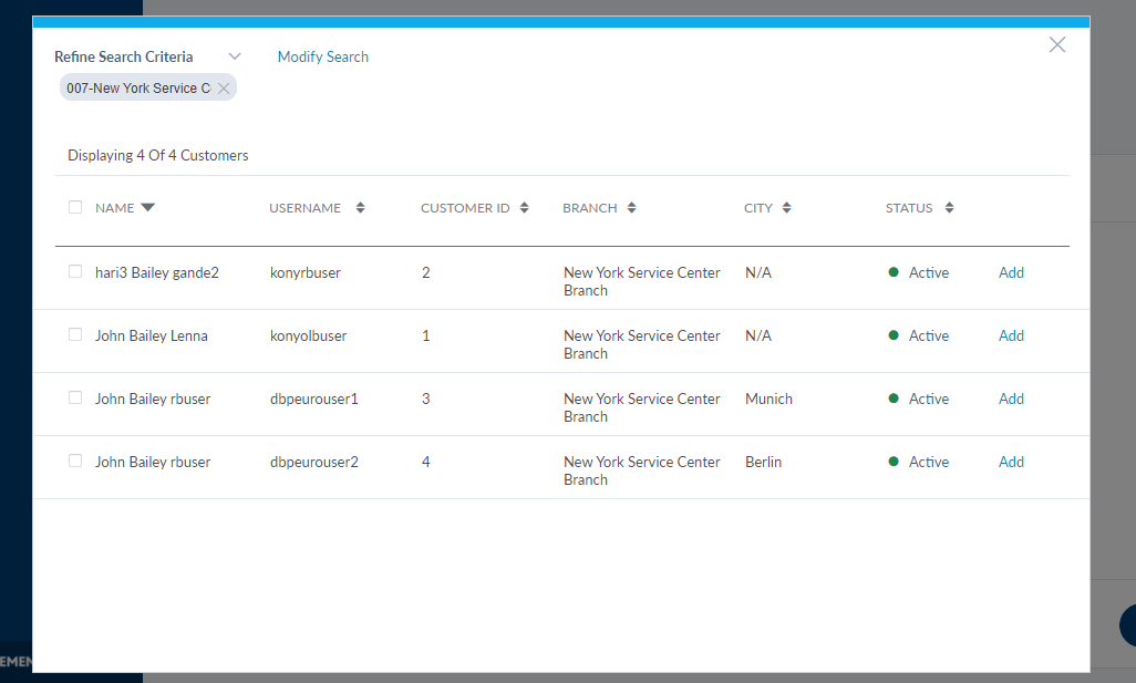 • The application displays the relevant search results list. The list contains the following details - Name, Username, Customer ID, Branch, City, and Status.