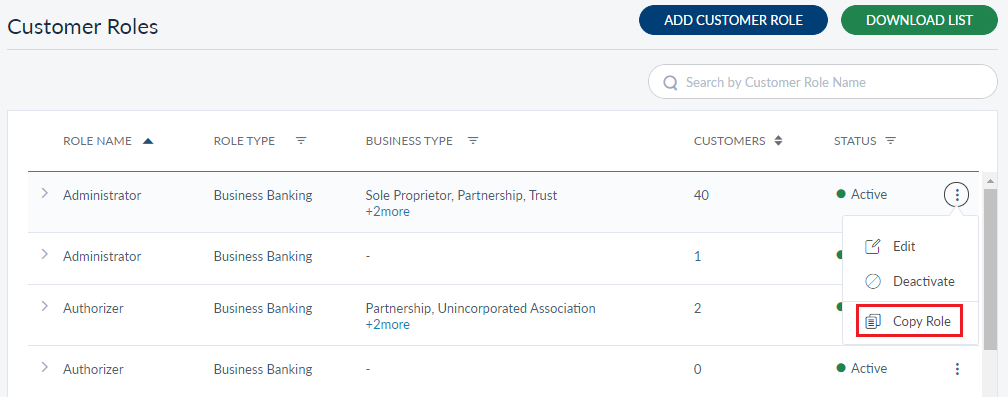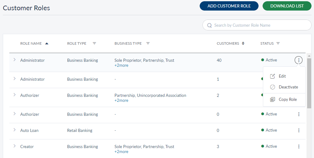 • Contextual menu to update customer role, deactivate and copy a role, as required.