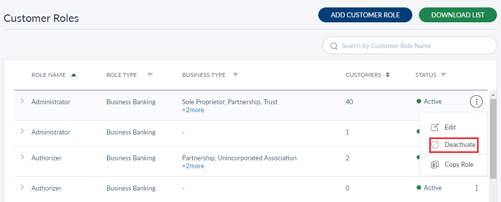 Click the contextual menu available on each row and update the status based on the current status of the customer role. The following statuses are available: Activate and Deactivate. For example, if the current status of a role is Active, you can Deactivate the role or vice versa.
