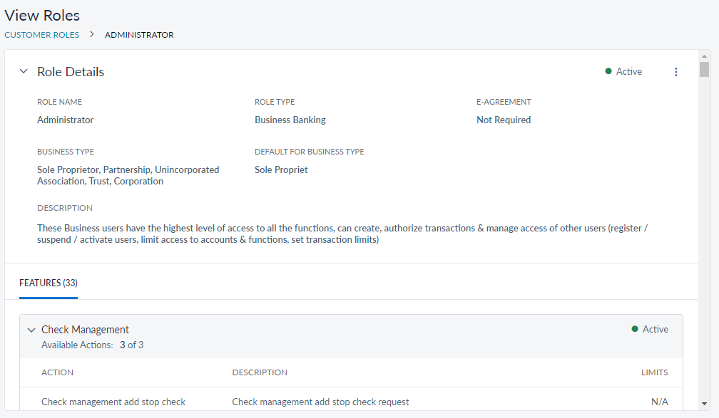 • Business Type - If the Role Type is Business Banking, then this section displays the associated Business Type(s) to which this role is applicable.