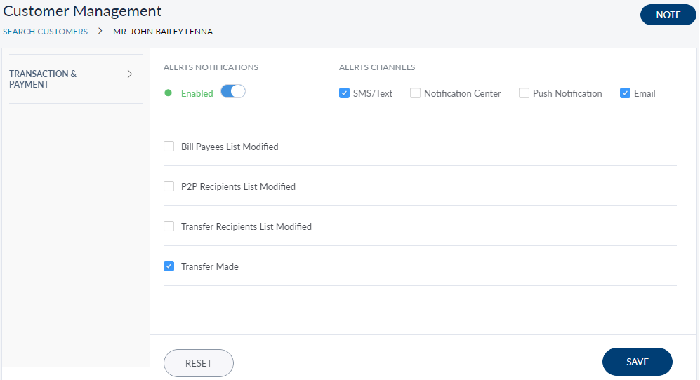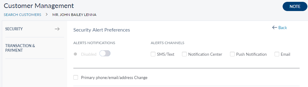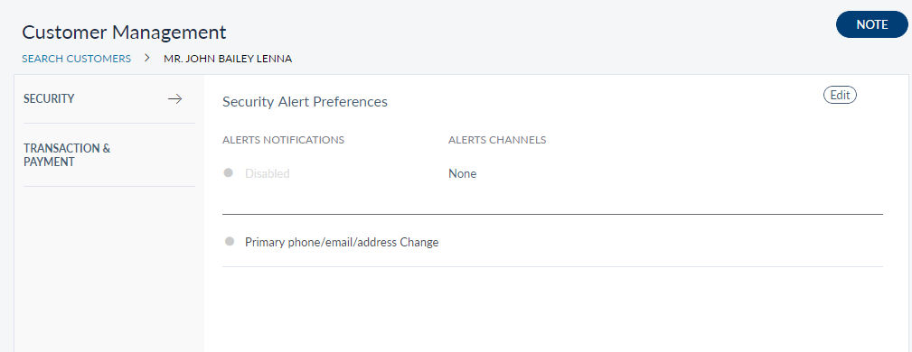 Click the Preferences tab to view and edit the customer alert preferences. The Preferences page has two sub-tabs - Security and Transaction & Payment. The Security tab is selected, by default. User can set a customer's alert preferences upon request.