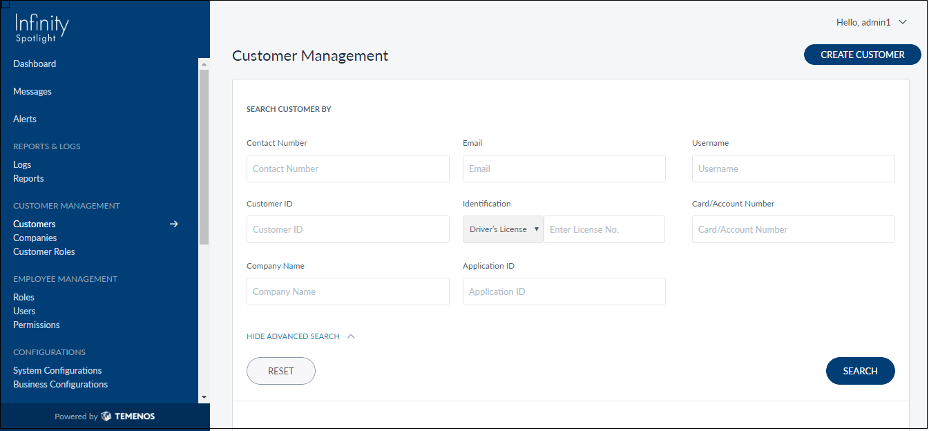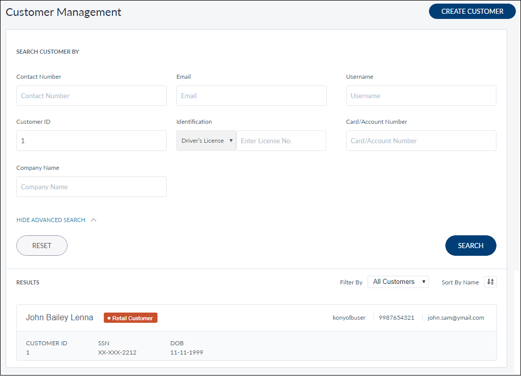 There are two search options: Normal Search and Advanced Search. Use the search options to search for an existing customer or an applicant. You can search by Contact Number, Email ID, or Username. In the Advanced Search, search by Customer ID, Company Name (for business customer only), Card/Account Number, Identification (Driver's license number, SSN, or Passport number). At least one of the fields is mandatory for search. Click Search. The app displays the matching records.