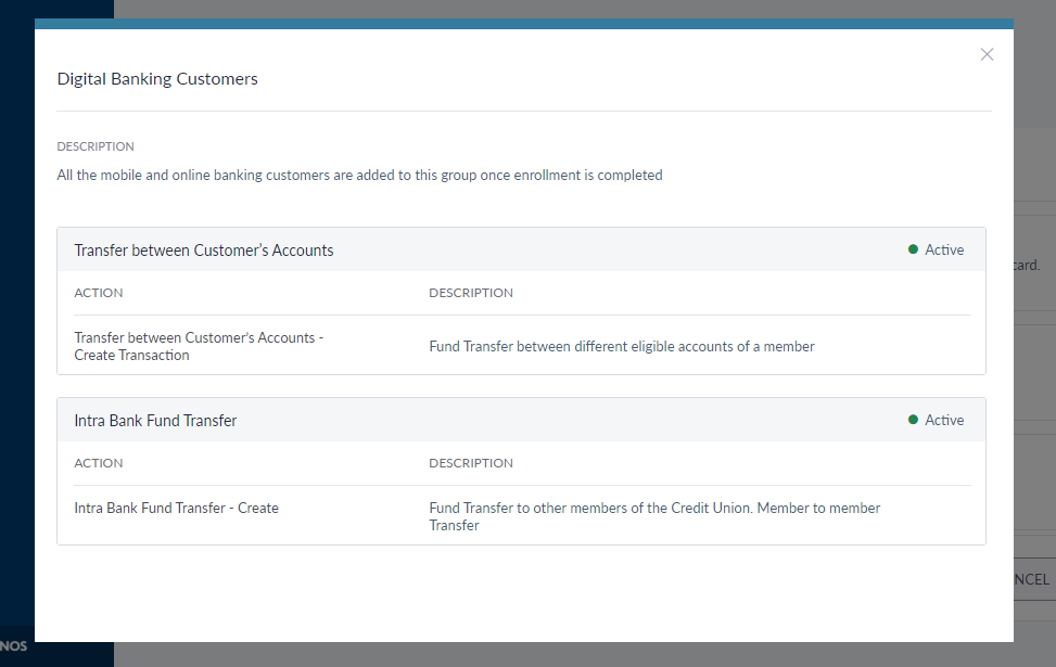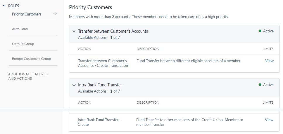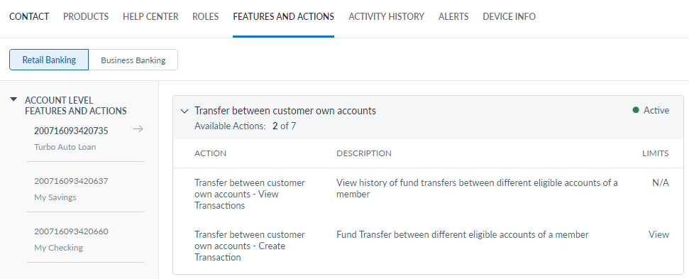 • Features and Actions: This tab contains Retail and Business Banking sub-tabs that list all the features and actions that the customer is entitled to at an account level and at a user level. A distinction is maintained between Retail and Business permissions.