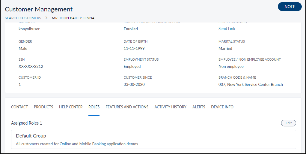 • Roles: The Roles tab contains Retail and Business Banking sub-tabs that display the role that the customer is assigned in their respective profiles. A combined user could have multiple Retail roles and additional features and actions that have been given to the user for personal use, outside of the Retail roles. A combined user would also have a business role.