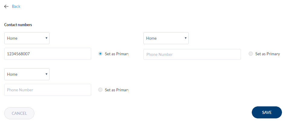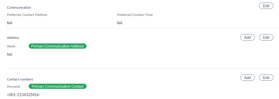 • Contact: The Retail contact and Business contact information of the customer is displayed in the respective tabs under the Contact tab. You can edit the details if you want from here. A single primary contact detail for communication exists for a combined user which is used to send alerts to the user. By default, the primary contact details are maintained set to be same as on the profile whose login credentials have been maintained for the combined user.