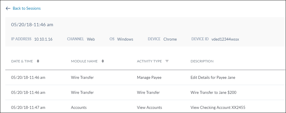 You can sort the list based on any of the columns by using the sort icon ( denotes sorted by that column) and filter the list based on Activity Type. Click Back to Sessions to navigate to the session list.