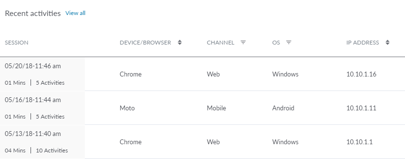 You can sort the list based on any of the columns by using the sort icon ( denotes sorted by that column) and filter the list based on Channel and OS. Select the required session if you want to view more details about the session and activities carried out in that session.