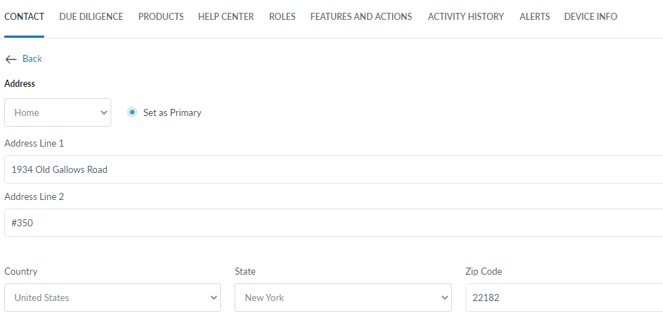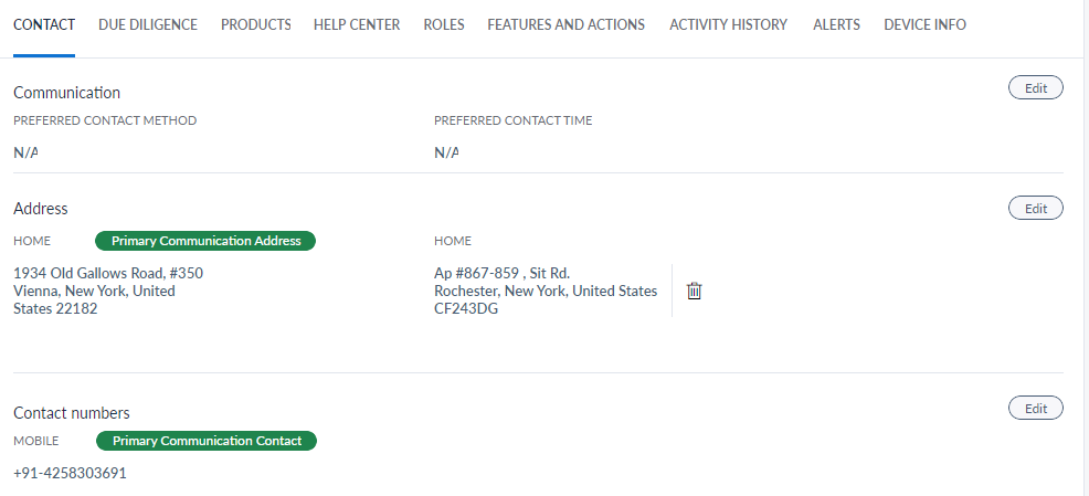 This section contains Contact, Products, Help Center, Roles, Features and Actions, Activity History, Alerts, and Device Info. You can click each tab to view the particular information. Click Add or Edit to perform the required activity.