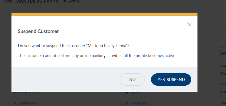 On the context menu , click Suspend. Once suspended, the customer cannot log on to the banking apps. The CSR can either suspend or activate a customer as required. On the confirmation screen, confirm the action.