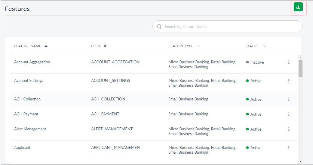 All the details listed here are fetched from the back-end system, and the CSR can view only the listed information. Sort the list based on any of the columns by using the sort icon (denotes sorted by that column). You can also filterthe list by Feature Type and Status (active or inactive). Using the download icon on the top right of the page, the CSR can download the list of features along with the details in an excel file.