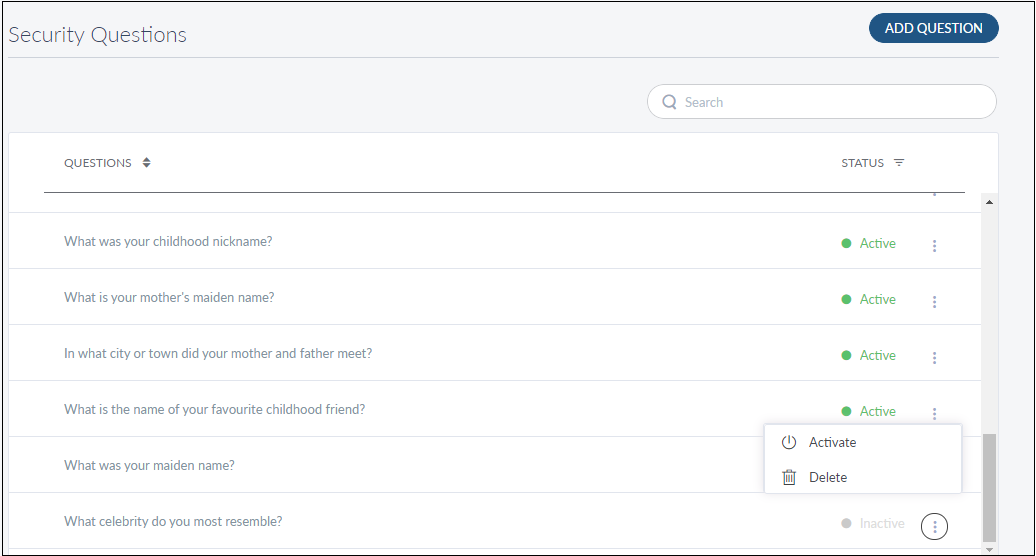 Use the feature to activate or deactivate a security question. Only those security questions with status as Active are displayed on the relevant app when users search for them.